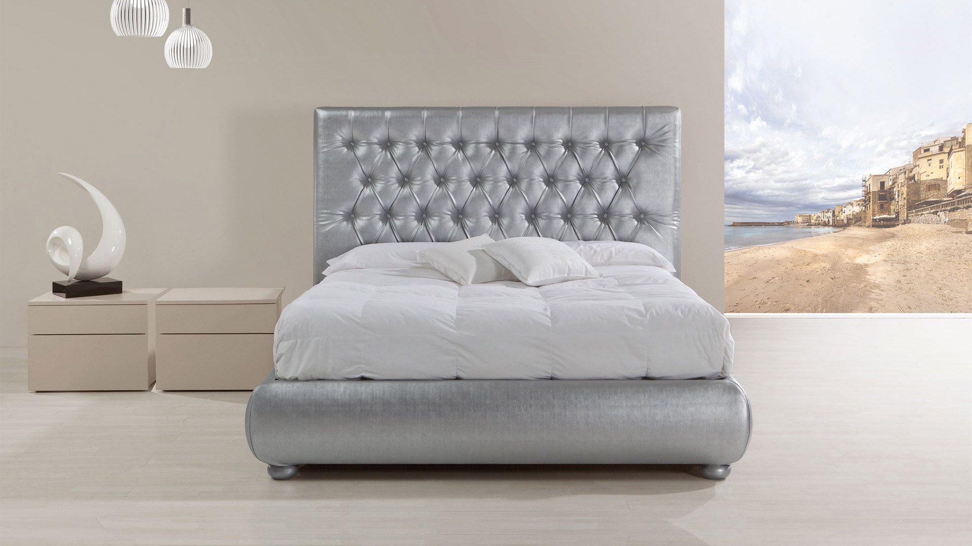 Letto dalle forme sinuose e classiche, ornato da un elegante lavorazione capitonné, con bottoni o Swarovski.
